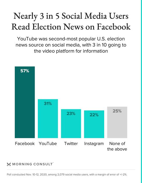 Researchers learned that the distribution of audiences that get news from social media depends on specific websites. For example, a minor part of Instagram or YouTube visitors search for news there. Things go the opposite way for Facebook and Twitter, as the majority of users are eager to read something fresh there